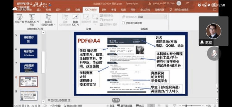 首先,苏钢向毕业生介绍了疫情下的就业形势。他指出:“当今处于疫情周期的末端,全球经济正在稳步复苏。我们的毕业生在求职中既有挑战更有机遇,我们要做好准备去面对新的就业环境”。接着,苏钢向毕业生讲授了简历制作的技巧,比如在写项目经历或者实习经历时,要做到术语准确、阐述精炼。此外,还要学会把个人信息进行分类总结,方便快速的提取信息。接着,苏钢向毕业生强调了简历中一些容易忽视的细节信息,要求我们制作简历时既要客观真实,也要学会灵活的组织语言。最后,苏钢给毕业生在学习通里建立了涵盖简历撰写、选题、开题、中期、毕业论文/设计和答辩等的课程,要求毕业生提交一份简历,事后会给予修改意见。