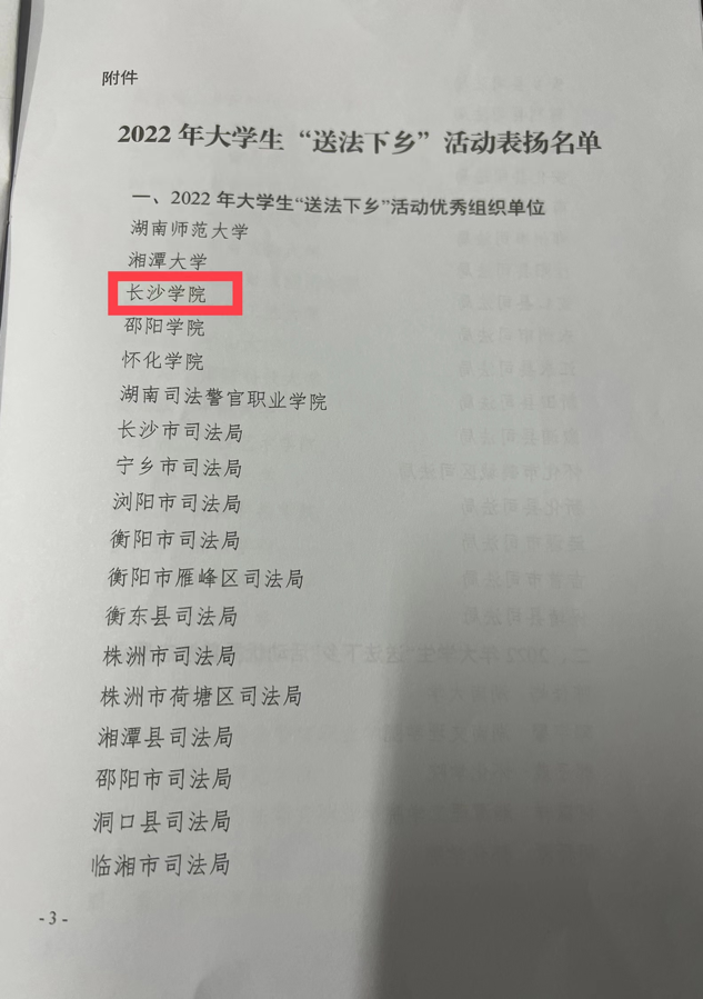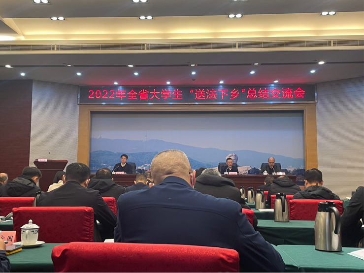 11月18日上午,湖南省司法厅在九所宾馆组织召开全省大学生“送法下乡”活动总结交流会。我校荣获2022年大学生“送法下乡”活动优秀组织单位,法学院20级法学专业赵文同学获得“送法下乡”活动“优秀普法志愿者”。