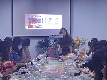 活动伊始,主持人简明地分析了大学生可能面临的负面情绪,并通过几个有趣的视频分享了调节情绪的小方法。随后工作人员为同学们发放钥匙扣、流体熊、颜料、明信片、礼品袋等材料,并组织同学们观看教学视频。接着同学们迫不及待地拿出自己的钥匙扣开始制作,工作人员走到参与者旁边耐心指导,一一解答同学们的问题。同学们也十分用心地参与,尽情发挥着自己的想像和创意,配制出五彩斑斓的颜色,再小心翼翼地为流体熊穿上了一件独具特色的“衣服”,钥匙扣制作大功告成。随后大家将温暖的话语写在明信片上,将流体熊钥匙扣带回晾干后,和明信片一同放入礼品袋中,亲自将这份充满祝福的礼物送到各位备考的学长学姐手中,并合影留念。至此,祝研沙龙活动便圆满结束了。