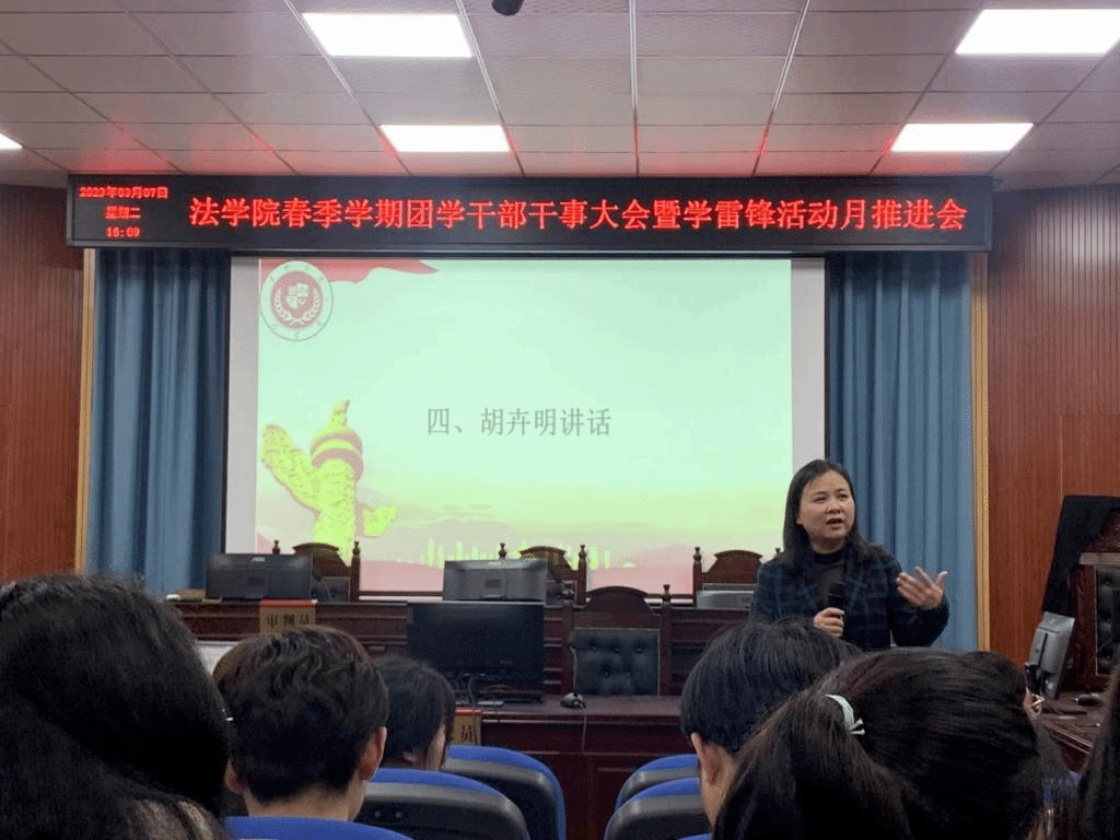 3月7日下午,法学院春季学期团总支学生会干部干事大会暨学雷锋活动月推进会在涵虚楼A多1教室顺利开展。党总支书记胡卉明、专职组织员夏湘远、副书记廖生成,辅导员钱文良、张正东以及团总支学生会全体干部干事参加此次会议。此次会议由廖生成主持,主要围绕新学期学生工作部署及学雷锋活动月推进工作内容展开。