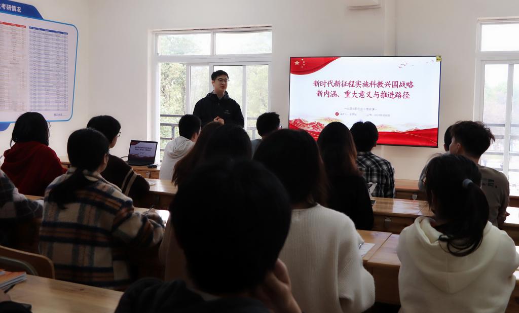 党的二十大报告指出:教育、科技、人才是全面建设社会主义现代化国家的基础性、战略性支撑。必须坚持科技是第一生产力、人才是第一资源、创新是第一动力,深入实施科教兴国战略、人才强国战略、创新驱动发展战略,开辟发展新领域新赛道,不断塑造发展新动能新优势。在活动的第一阶段,学生第一、第二、第三支部书记裴昊铭、龚越、林涵紧扣“科教兴国战略”这一主题,分别从新时代新征程赋予科教兴国战略新内涵、新时代新征程深入实施科教兴国战略的重大意义、新时代新征程深入实施科教兴国战略的推进路径等三个部分为同学们上了题为《新时代新征程实施科教兴国战略新内涵、重大意义与推进路径》的新学期第一堂党课。