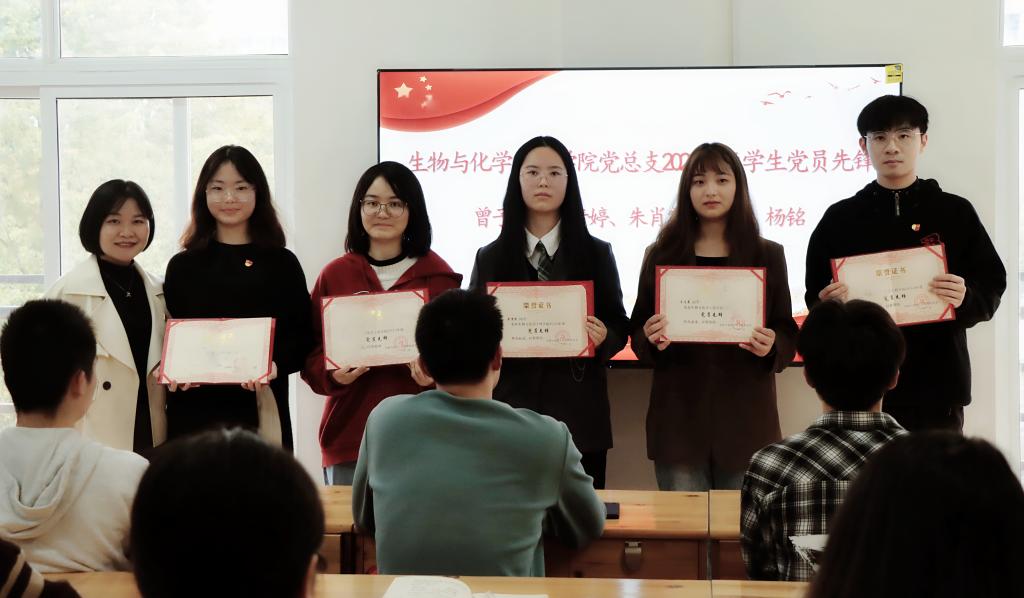 活动的第二阶段为生化学院2022年度党员先锋事迹分享暨表彰。“何鱼作队”学术科研团队被评为学院2022年度党员先锋,该团队指导老师为学院教工二支部委员何志敏老师,核心成员包括曾子豪、余凊婷、朱肖霞、刘娜、杨铭(均为学生党员)。团队依托水生动物营养与品质调控湖南省重点实验室,聚焦水生动物饲料营养高效转化机制的关键科学问题,从水生动物肠道营养小肽的转运机制、呈味小肽的品质调控机制等方面开展系统研究,建立水生动物营养调控技术,研发“环境友好、资源节约”饲料新产品,为水产生态养殖提供重要的理论和技术支撑。团队始终坚持求真问学,传承创新。近三年来,团队成员累计发表论文4篇;申报专利1项;获得国家级、省级学科竞赛奖项8项;14人考取了硕士研究生;9人光荣地加入了中国共产党。团队成员刘娜作为代表分享了团队开放式吸纳与连续式培养的组建过程、师生党员意志坚定共同进步的备赛经历和团队脚踏实地不断超越的科研品质。