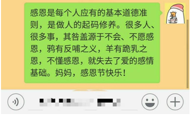 11月22日—11月28日,电信学院发起了线上 “感恩有你”活动。活动号召同学们通过QQ、微信或短信等方式将感恩话语发给亲人、老师、朋友或同学,并将感恩留言截图发给工作人员。工作人员对感恩留言进行汇总并在电信学院“长大电缘”公众号上公布。该活动共有400多名同学参与互动,精心评选出10组优秀感恩留言。“爸爸是一位不善于表达感情的人,平时跟爸爸交流很少,我给爸爸发送了感恩留言,很意外收到了爸爸的回复,阅读着爸爸鼓励的话语,自己眼泪忍不住流了出来”,陈同学说,“通过感恩留言,贴近了与爸爸的情感交流。”