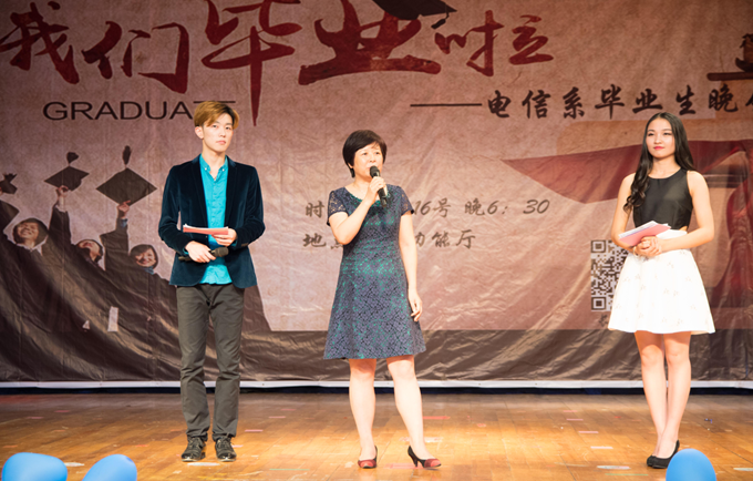 晚七时,晚会在《长大的日子》视频中拉开帷幕,入校时提着大包小包报到的青涩面庞,军训时激情四溢的剪影,东来阁讲坛上的指点江山、激扬文字,小红帽志愿者忙碌的身影,足球、篮球等各类比赛中的奋勇争先、图书馆内的奋笔疾书,穿上学士服的兴奋与不舍,视频中每一幅画面都是毕业生最美好的回忆,深深地感染着在场的每一位师生。石学兰书记代表系部老师致辞,她首先感谢毕业班的同学们为系部的发展所付出的心血与汗水;希望同学们珍惜同学情、师生情、朋友情,常回家看看,电信系永远是同学们的坚强后盾;同时表达了对毕业生深深的不舍和最真切的祝福。
