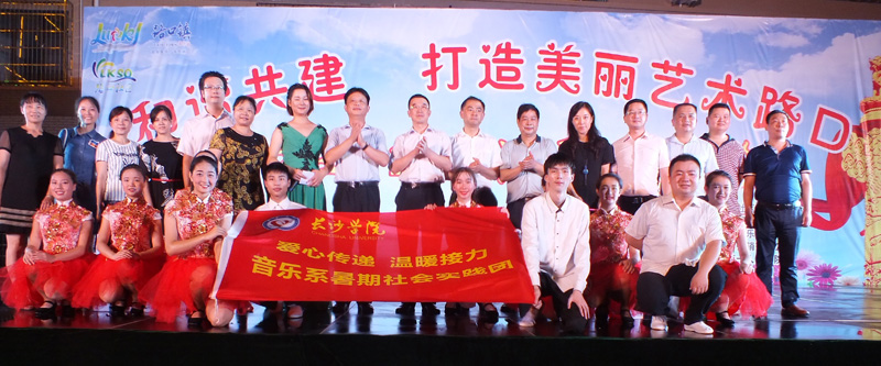 为响应新农村文化建设的需要,长沙学院音乐系大学生暑期三下乡社会实践团队于7月4日至7月13日来到长沙县路口镇路口社区,教授村民们歌曲和舞蹈,并积极筹备消夏晚会。实践团11位同学在系领导的亲切关怀下,在辅导员张腾老师的悉心指导下,与路口社区工作人员、社区辖内各企事业单位人员、社区居民一起,不辞辛苦,日夜排练,在仅仅10天的时间里,共同打造了一台消夏晚会,为路口镇村民们献上了一道丰盛的文化大餐。