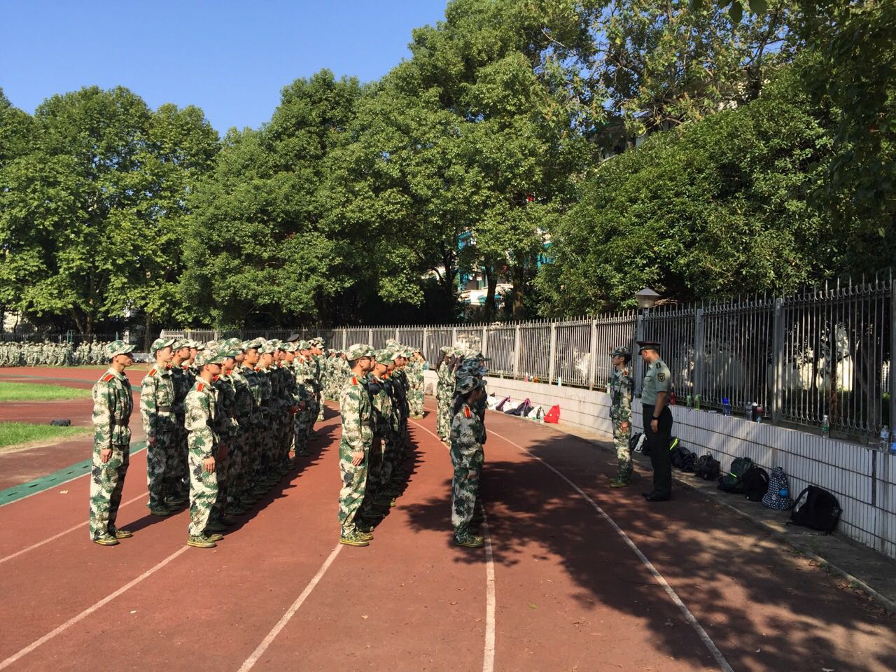 数计系的新生军训编为三营,下辖七个连队,每两个行政自然班为一个连,分在永康田径场进行操练。9月13日上午六点二十,所有学生按时到达训练场地,有条不紊的在七名教官的组织下进行了晨练,训练内容完全参照既定方案,同时上午进行了体检的抽血项目,下午举行了图像采集活动,内容紧凑合理,训练张弛有度。