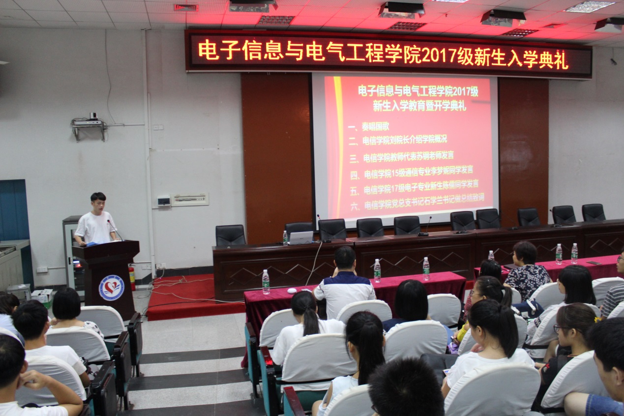 9月12日上午,电子信息与电气工程学院2017级新生入学典礼在致远楼学术报告厅隆重举行。电信学院院长刘光灿,党总支书记石学兰,电子信息工程教研室主任龙英,通信工程教研室副教授苏钢,学生辅导员江艳、黄佳佳以及17级全体新生出席了会议。会议由江艳主持。