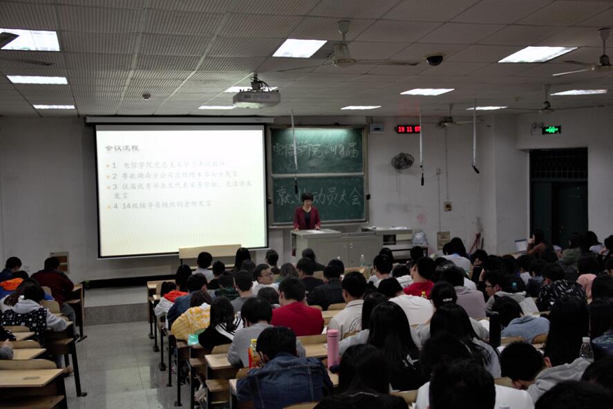 为帮助电信学院2018届毕业生清醒认识当前严峻的就业形势,指导同学们正确择业,2017年11月2日晚7点,电信学院2018届毕业生就业动员大会在涵虚楼A多1顺利举行。电信学院党总支书记石学兰,粤嵌湖南分公司总经理朱容,学工办主任江艳,14级辅导员杨然钧,优秀毕业生代表宋芳学姐和龙洁学长,全院应届毕业生出席了本次大会。会议由杨然钧老师主持。
