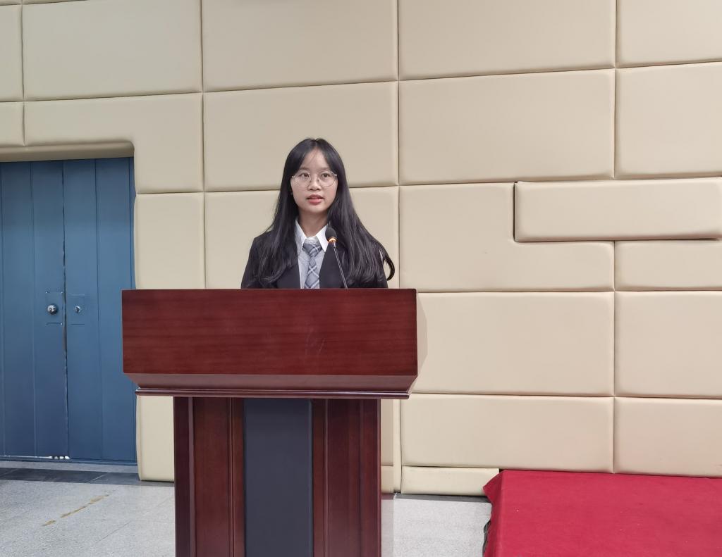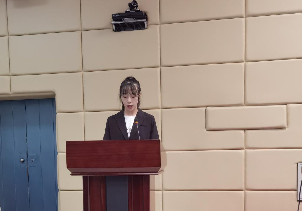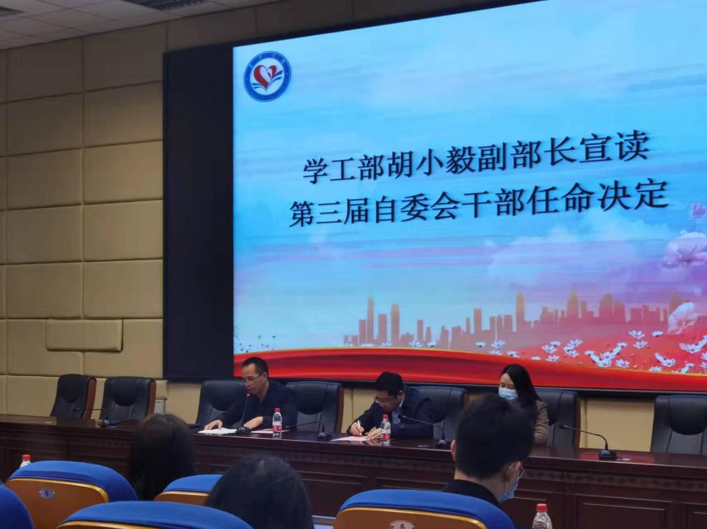 第二届自委会轮值会长肖倩同学做上一学年工作汇报。第三届自委会轮值会长代表舒炳竣同学、楼栋长代表刘娟同学分别表态发言。