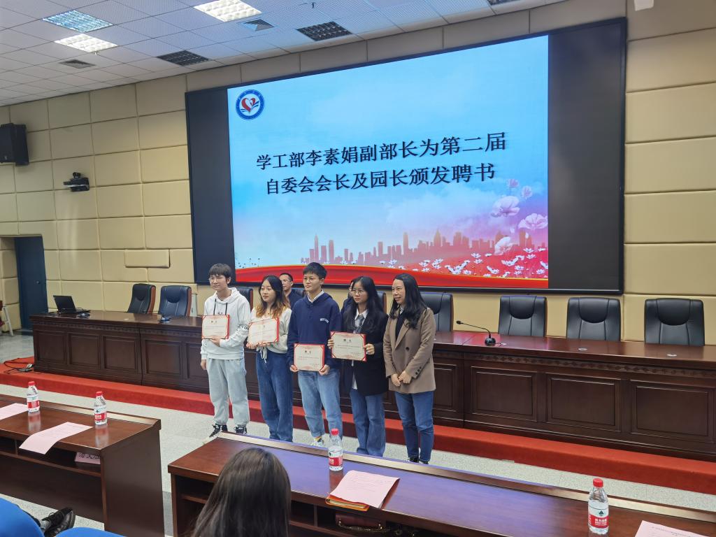 学工部胡小毅副部长宣读第三届学生宿舍自主管理委员会干部任命决定,李素娟副部长为第二届自委会会长及园长颁发聘书。