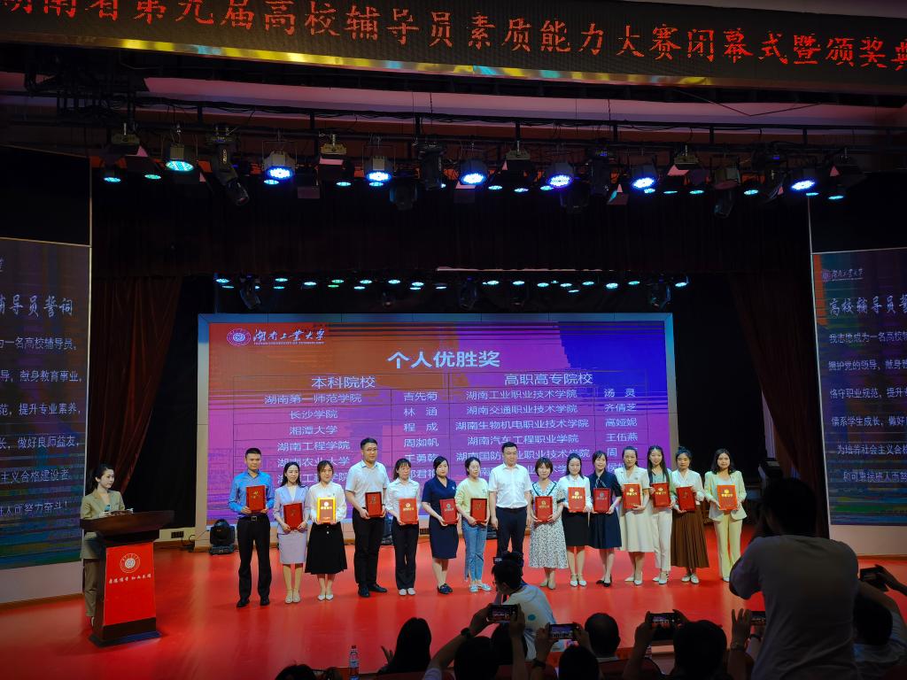 6月1至2日,湖南省第九届高校辅导员素质能力大赛决赛在湖南工业大学举行。经过基础知识测试、案例研讨与谈心谈话三个环节的比拼,我校辅导员林涵在全省参赛的36名辅导员中排名第20,荣获优胜奖。