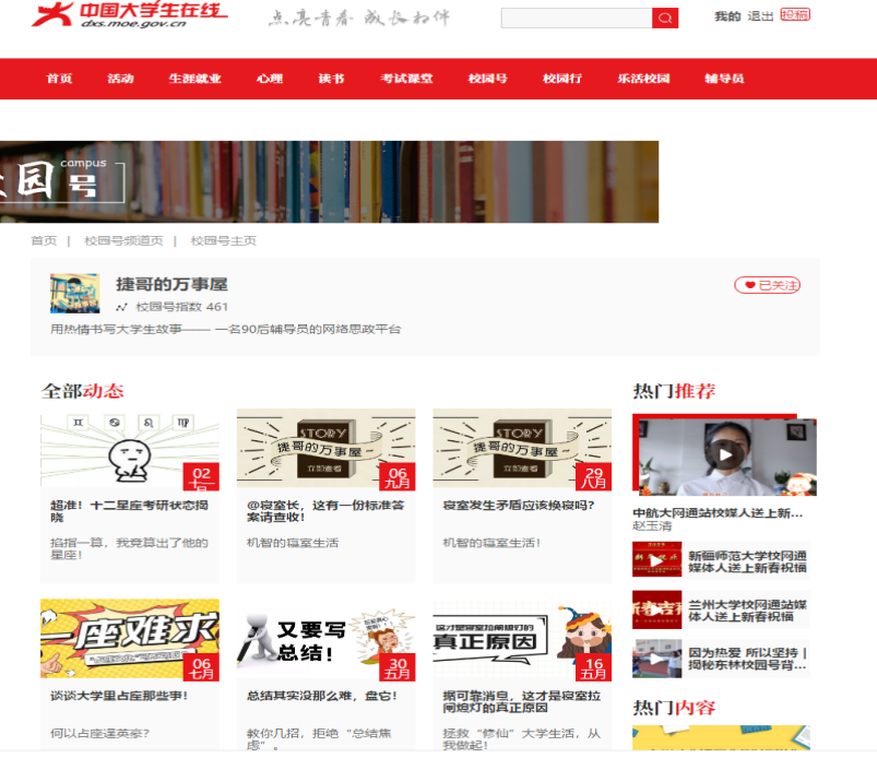 同步在“教育部中国大学生在线”开辟了同名专栏号——捷哥的万事屋,人气值多次在“中国大学生在线”全国专栏号热度榜中排名第1。