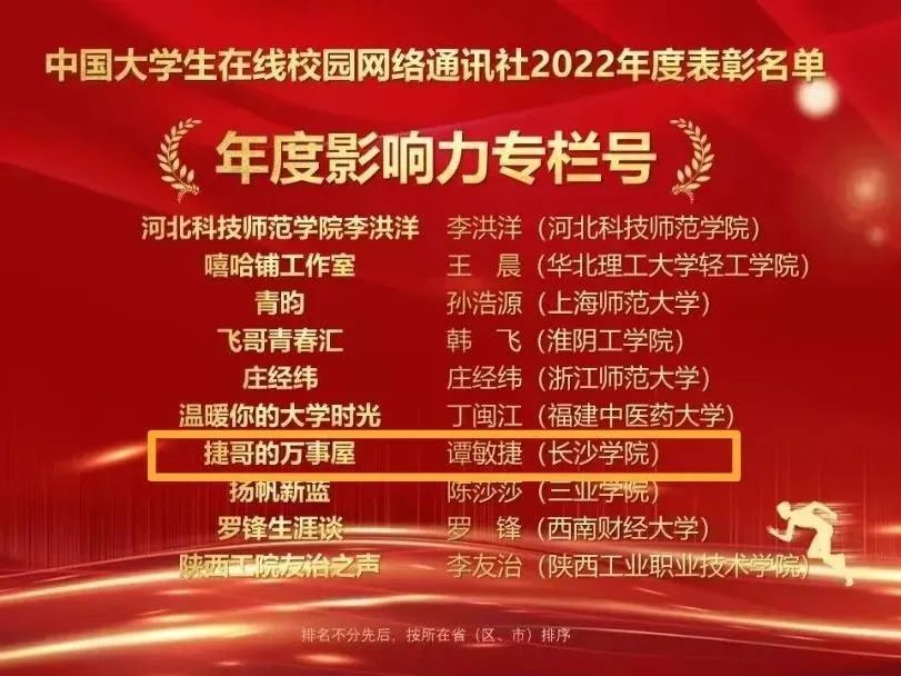 近日,中国大学生在线公布了2022年度校网通站及校园行活动优秀名单。根据每周的专栏号热度排行榜(包括推文数量、点赞量、评论数量等),我校辅导员谭敏捷的专栏号“捷哥的万事屋”被评为年度影响力专栏号!
