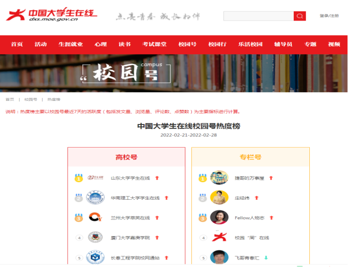 多次在“教育部中国大学生在线”专栏号热度榜排名第1