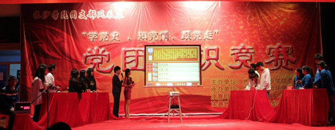 通过层层选拔,十二支队伍脱颖而出,晋级决赛。他们通过抽签方式被分为三个小组,每组依次进行两轮比赛。每轮比赛由必答题和抢答题两个环节组成。亲友团可在比赛过程中投票,票数最高的团支部将获得最佳人气奖。比赛的题目范围广泛,不仅涉及中国共产党的历史,还涉及新近召开的十八届三中全会。十二支参赛队伍在必答题环节中不分伯仲,有六支队伍都答对五道及五道以上的题目。而第二环节抢答题考验的不只是选手的知识储备,更考验各选手的临场反应力。在抢答铃声响后要立即按下抢答器。生物工程与环境科学系应化1班的代表队在第一轮中凭借必答题全部回答正确并成功抢到两道抢答题的优势独占鳌头。第二轮比赛,应化1班乘胜追击,稳扎稳打地夺下200分,最终以390分的高分摘得桂冠。除了舞台上精彩的比赛之外,场下的微信互动墙也成为了现场一道亮丽的风景线。 名为"红尘醉微熏"的同学留言:"信科信科,英勇夺冠;信科信科,所向披靡"。诸如此类的加油口号在微信墙上滚动着,亲友团们都在通过微信为自己的班级加油。现场气氛火热,观众积极参与。