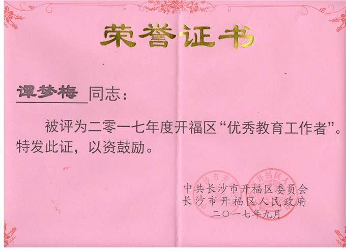 会议对在开福区教育工作中涌现出来的先进典型进行了表彰。我校谭梦梅、刘晓慧两位教师分别获得开福区“优秀教育工作者”、“‘四有’教师”光荣称号。