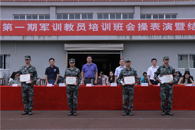 检阅完毕。出席校领导对在训练中表现突出的28名优秀自训教员进行了表彰;出席典礼的校领导为自训教员颁发了“四会”教练员证书并检查了他们的内务。