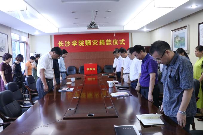 7月10日上午,学校在办公楼第二会议室举行赈灾捐款仪式。仪式伊始,校党委书记韦成龙代表全校师生向灾区群众表示慰问并提议,参加捐款仪式的校领导和二级党组织负责人全体起立,为在这次特大洪灾中遇难的同胞默哀。
