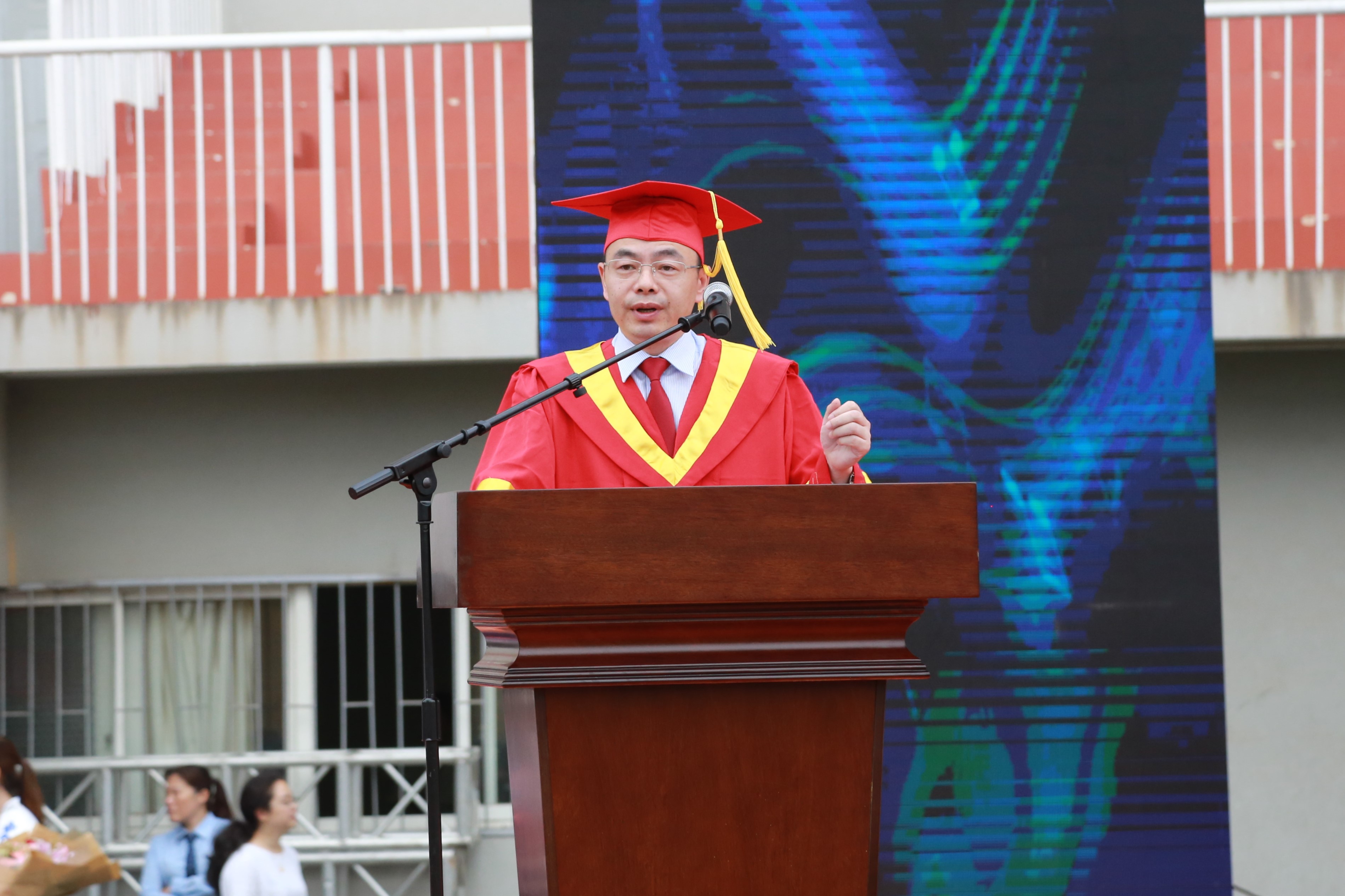 党委副书记、校长杨小云发表了热情洋溢的讲话。他代表学校对圆满完成学业并即将开启人生新征程的毕业生们表示真挚祝贺,并向执鞭杏坛、辛勤耕耘的老师们表达衷心感谢。他指出,“崇德、实干、担当”六字,是长大内在的文化基因,是长大的精神长相,是长大学子独一无二的精神名片。杨小云简要介绍了学校近两年的获奖情况及考研成果,肯定了长大学子们脚踏实地、顽强拼搏的实干精神。他还高度赞扬了我校2017届毕业生中的11位勇于担当、心怀大爱的援藏、援疆优秀毕业生,“在他们身上体现出‘苟利国家生死以,岂因祸福避趋之’、哪里需要就去哪里的强烈家国情怀和社会责任感,令人动容”。长大是长大莘莘学子的精神家园,杨小云希望所有长大学子都能植根长大沃土,不忘初心、苦干实干、勇于担当,把长大精神发扬光大,书写出雄壮的生命乐章。