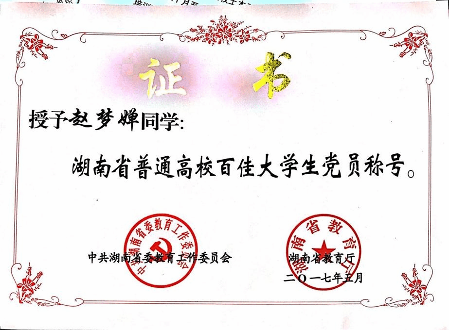 近日,接湖南省委教育工作委员会、湖南省教育厅《关于表彰湖南省普通高校百佳大学生党员的通报》,我校机电工程学院刘谱俊、影视艺术与文化传播学院赵梦婵两名同学获2017年度“湖南省普通高校百佳大学生党员”荣誉称号。