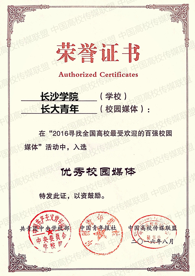 近日,由共青团中央学校部指导,中国青年报社、中国高校传媒联盟共同主办的“2016寻找全国高校最受欢迎的百强校园媒体”评选活动结果揭晓,我校团委新媒体平台“长大青年”位列校园媒体百强名单第17名,并荣获“优秀校园媒体”称号。