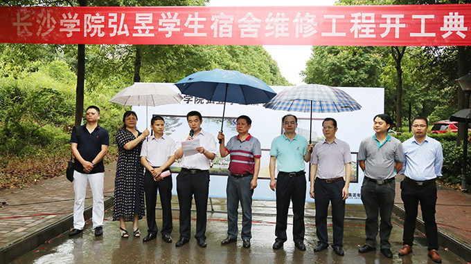 后勤处处长余文龙为大家简要介绍了弘昱学生宿舍维修工程项目。湖南教建集团有限公司董事长张友贵、长沙湘沙建设项目管理公司总经理助理李剑分别发言,对我校弘昱学生宿舍的维修工程开工致以真诚的祝贺,承诺将在施工过程中高标准、高要求、按质按量地完成项目建设,以保证新生顺利入学。