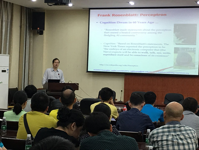 应数学与计算机科学系刘华富教授及中科院计算所普适计算研究中心陈益强教授的邀请,6月2日,神经网络和模式识别领域的国际知名专家、新加坡南洋理工大学(Nanyang Technological University, Singapore)电气和电子工程学院黄广斌教授访问了数学与计算机科学系,并在图书馆会议室为该系师生做了题为“从AlphaGo战胜人类展望机器学习的新趋势—超限学习机(ELM)和深度学习(DL)的有机结合及ELMGo探讨”的精彩报告,报告会由数计系副主任潘怡博士主持。
