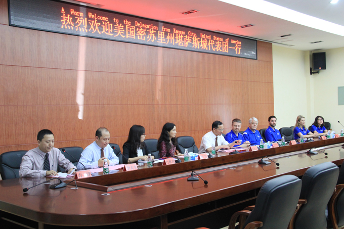 代表团先参观了我校校园。随后,我校在图书馆会议室举办了简单的欢迎仪式。副院长屈林岩教授代表师生对来访的堪萨斯城市友好代表团表示热烈的欢迎,并简要介绍了我校的基本情况。刘芳副会长代表长沙市对外友好协会致辞。Scott Wagner先生代表访问团简要介绍了此行目的,并表达了对堪萨斯市和长沙市、密苏里大学与长沙学院在文化、教育、科技等方面开展合作与交流的愿望。