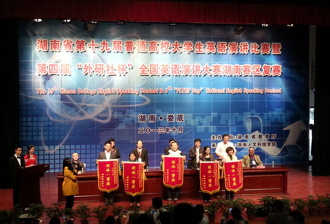 由湖南省教育厅举办的湖南省第十九届普通高校大学生英语演讲比赛暨第四届"外研社杯"全国英语演讲大赛湖南赛区复赛于10月19-20日在湖南人文科技学院举行。湖南省共有52支代表队(含本科一组,本科二组和高职高专)、156名选手参赛。本次大赛主题是"When Confucius meets Socrates"。选手们各抒己见,挥洒激情,掀起多次高潮,展现了各校英语教学水平,上演了一场全省高校英语演讲实力的巅峰对决。我校代表队参加了本科一组的角逐。在公共外语教学部刘杰、黎芳、李珺、陈杨四位指导老师辛勤付出和耐心指导下,队员不畏强手,顽强拼搏,以出色的成绩战胜诸多高校,斩获团体一等奖。 计算机系11级软件工程九班杨晴和外语系11级日语四班蔡任在非专业组中分获个人一等奖和二等奖;在专业组的比赛中,外语系11级英语国贸二班张媛媛亦获得个人二等奖的佳绩。