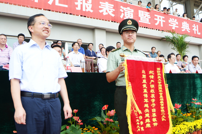 副院长屈林岩宣读了《长沙学院关于表彰2013年军训先进集体、先进个人的决定》并向承训单位赠送了锦旗。