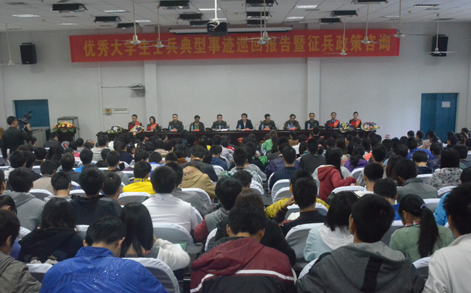 10月31日上午10点,长沙警备区组织优秀大学生士兵典型事迹巡回报告团在我校致远楼学术报告厅举行优秀大学生士兵典型事迹报告暨征兵政策咨询活动。长沙警备区政治部副主任洪军、我校副院长陈大川、开福区政府副区长任新良、长沙警备区司令部动员办主任赵佑华、开福区人武部副部长黄卫国、我校武装部部长夏湘远及部分辅导员和学生出席了本次活动。活动由郭朋芳政委主持。