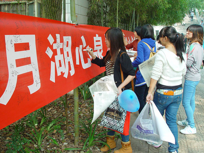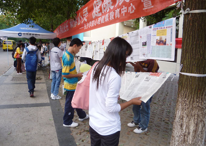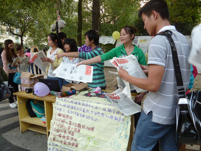活动现场,《月湖心泉》编辑部和校系心理部的同学们为大家悬挂陈列了《月湖心泉》报创刊至今的41份报纸,展示了《月湖心泉》的成长历程;他们还为前来参观的同学热情地介绍报纸内容,以抽奖的方式,将报纸、心形便利贴、心情便签纸作为获奖礼物赠送给参与活动的同学,并开展了签名活动。同时,他们发放了400份读者调查表,调查同学们对《月湖心泉》报纸的知晓度、满意度、宝贵意见。