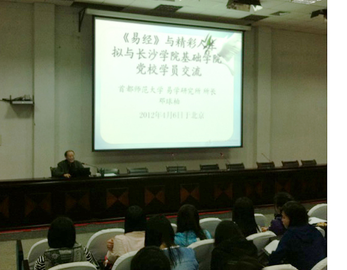 在讲座中,邓球柏教授首先从中共十七届六中全会中胡锦涛总书记提出的"关于发展社会主义先进文化"入题,阐述了文化建设对社会发展的重要性和《易经》的深刻文化内涵及现实意义。"夫大人者,与天地合其德,与日月合其明",在进行"易经与精彩人生"的主题讲座时,邓教授主要从精彩人生美德、精彩人生知识、精彩人生能力和精彩人生智慧四个方面讲述了"易经与精彩人生"相辅相成的关系,并指出作为入党积极分子要有责任、有义务大力推进文化创新,努力学习,要具备精彩人生所提倡的诚信、知识、能力与智慧。
