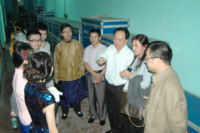 演出开始前,校领导黄中瑞、李云龙亲临舞台后场看望我校参与演出的全体演职人员。党委书记黄中瑞代表学校对他们的辛勤付出表示感谢,对他们所获得的成绩表示祝贺,并预祝他们此次演出获得圆满成功。