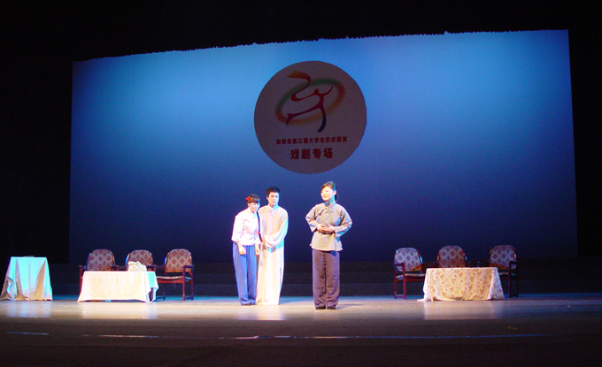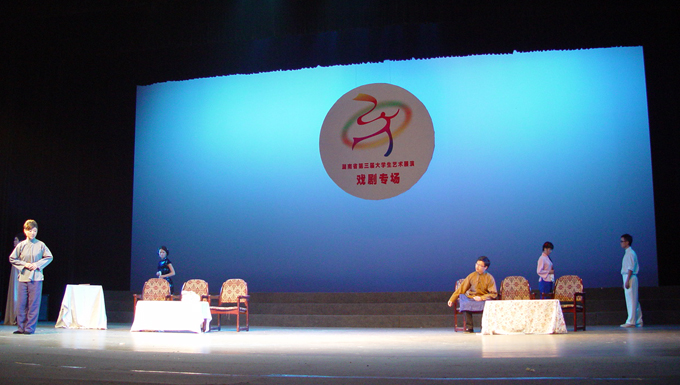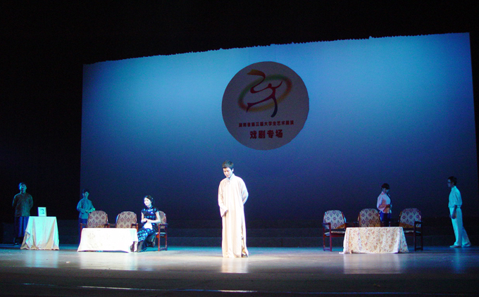 由湖南省教育厅主办、以《青春·使命》为主题的湖南省第三届大学生艺术展演活动于2010年10月启动,全省共22所高校参加此次活动。该活动的项目分为艺术表演类、艺术作品类、高校校长书画摄影作品和高校艺术教育科研论文四类。由我校中文与新闻传播系播音与主持专业的学生排演的经典话剧《雷雨》脱颖而出,以精湛的演技、投入的演出以及对人物角色的完美诠释斩获艺术表演类一等奖,并获得了艺术展演现场演出的资格。同时由该系自创的话剧《青春突围》荣获艺术表演类三等奖。