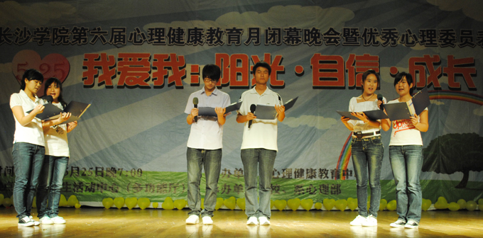 5月25日是全国大学生心理健康日,"525"谐音即为"我爱我",旨在提醒大学生关爱自我、了解自我、接纳自我。5月25日晚,由校心理健康教育中心主办,校、系心理部承办的"第六届心理健康月闭幕晚会暨优秀心理委员表彰大会"在学生活动中心举行。学生工作处、机电工程系、计算机科学与技术系、旅游管理系、法学与公共管理系、中文与新闻传播系、基础学院的相关负责人以及各系心理联络员老师和学生会负责人参加了本次晚会。