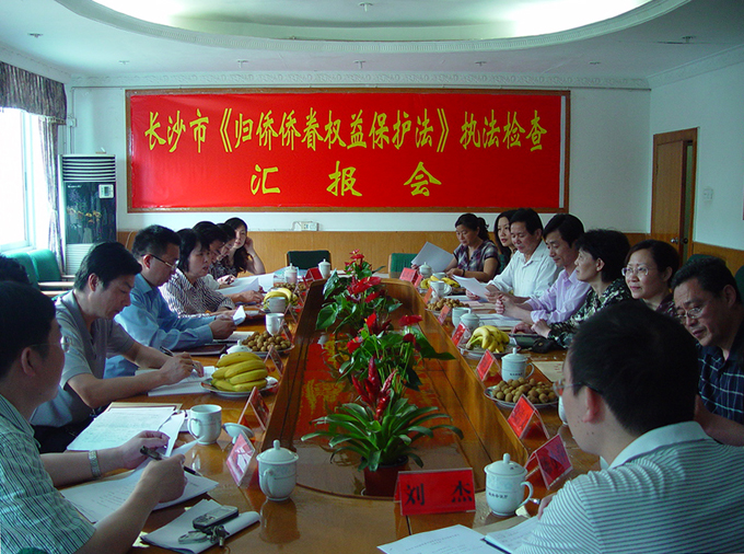 4月28日下午3点,市人大常委会副秘书长赵凡存、市人大民族华侨外事委员会主任周建军带领由市侨联、市政府外联处、市外侨办、市人大民侨外委等组成的长沙市侨务工作执法检查组,来我校检查《中华人民共和国归侨侨眷权益保护法》、《中华人民共和国归侨侨眷权益保护法实施办法》和湖南省实施《中华人民共和国归侨侨眷权益保护法》办法(简称"一法两办法")的贯彻落实情况。我校副院长王永宏、统战部部长梁仡娜、侨联主席张建社及校侨联全体委员在办公楼二会议室热情接待了检查组一行。