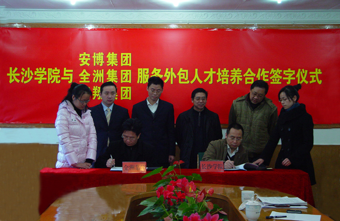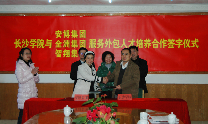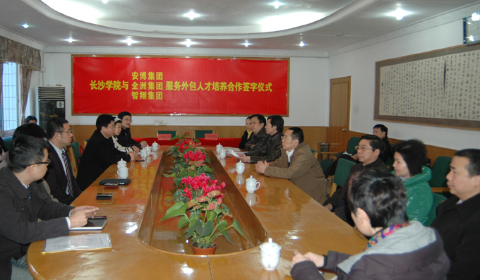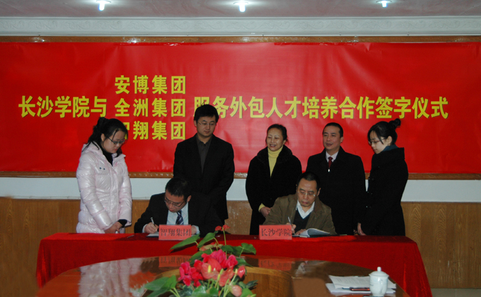 服务外包业是一项新兴产业,教育部、商务部高度重视校企合作服务外包人才培养,并在政策上、资金上大力扶持。为充分实现高校与企业的资源互补与共享,努力培养与实际相结合的高层次、应用型、复合型人才,经过前一阶段交流与反复磋商, 1月17日上午,我校与安博集团、全洲物流集团、智翔集团服务外包人才培养合作签字仪式在办公楼二会议室举行。院长刘耘、副院长王永宏、服务外包理事会理事长彭劲松,全洲物流集团董事长兼总裁周求华、安博教育牛耳公司总经理赵静芳、智翔集团副总裁包雨出席了签字仪式。相关系部的负责人和企业代表参加了会议。仪式由副院长王永宏主持。