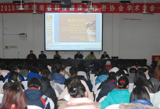 1月8日上午9点,由长沙学院外语系承办的2010年度湖南省科技翻译工作者协会学术年会在我校致远楼学术报告厅举行。来自全省部分高等院校、翻译公司、政府部门、大型企业的代表以及我校外语系部分师生共200余名参加了本次研讨会。大会由湖南大学徐国强教授主持,长沙学院副院长郭清泉教授代表学校对参加此次学术年会的代表表示热烈欢迎,并向各位来宾简单介绍了学校的情况。湖南省科技翻译协会会长盛之教授以"海阔凭鱼跃,天高任鸟飞"为题,做了协会2010年的工作报告。