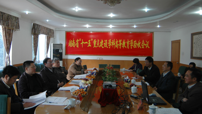 12月23日上午,湖南省"十一五"重点建设学科验收会议在我校召开。我校省"十一五"重点建设学科--高等教育学接受专家验收及实地检查。受教育厅委托的验收专家组由中南大学副校长李桂源教授、湖南科技大学副校长冯涛教授、国防科技大学航天系主任唐国金教授、长沙理工大学桥梁与材料工程学院院长颜东煌教授、湖南商学院会计学院院长朱开悉教授组成,专家组组长与副组长分别由李桂源教授、冯涛教授担任。会议由我校郭清泉副院长主持,刘耘院长、屈林岩副院长出席会议。参加会议的还有相关学科和部门的负责人。