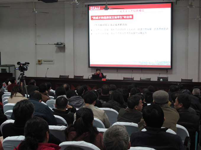 阳明学院是宁波大学按大类培养人才改革创新中诞生的一个新学院。在简要介绍了阳明学院的办学历史、机构设置、人才培养模式后,方志梅院长结合自身工作经验从选拔方式、培养目标、课程设置和学生管理等四方面对阳明学院按大类培养人才的改革内容进行了深入浅出的阐述。方院长强调,阳明学院的宗旨是"把成才的选择权交给学生,让学生自主选择教学资源。"同时,她总结了该学院在按大类培养人才改革中取得的成效与存在的问题,一方面,改革提高了学生的选择意识和选择能力,促进了学校教学资源和结构优化;另一方面,改革与传统教学管理体制发生着冲突,传统优势专业的生存与发展面临着挑战。