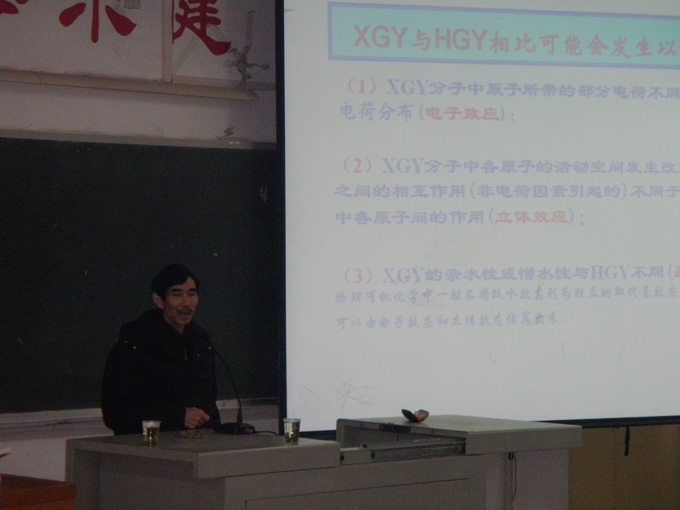 12月28日下午,湖南科技大学副校长、博士生导师、全国模范教师曹晨忠教授应邀来我校作了题为"取代基电子效应的定量及其应用"的学术报告。学术报告由我校党委副书记、副院长李云龙主持,教务处处长张世英、生物工程与环境科学系主任张建社、党总支书记罗永兰及相关教师与学生一道听取了曹晨忠教授的报告。