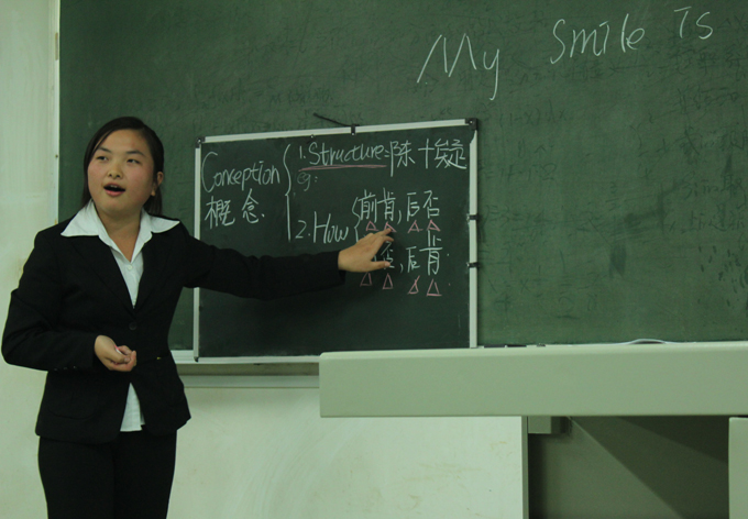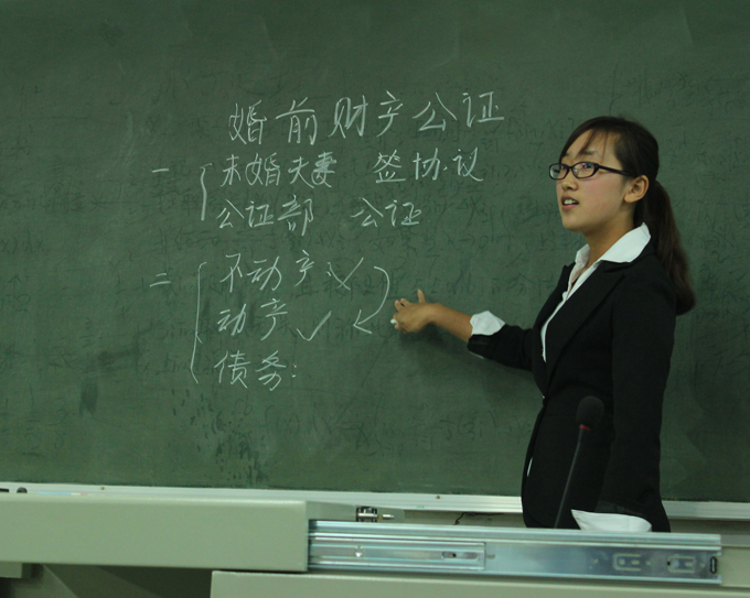 经过初赛、复赛,共有10名选手进入决赛。比赛中,参赛选手各有10分钟的时间进行自我介绍和授课,评委们将从授课内容、技巧、普通话、互动情况等方面进行打分。来自中文与新闻传播系的3号选手冯青,教授"同角三角函数基本关系式",声音洪亮,吐字清晰。在授课时,他图文并茂,积极与台下观众交流互动。白衬衫、小西装、黑框眼镜,4号选手郭木子讲授的"婚姻家庭法"给观众留下了深刻印象。她着装正式,授课条理清楚。