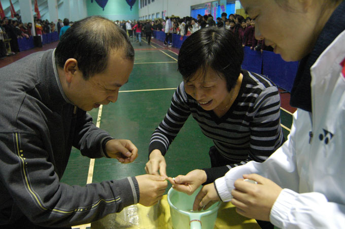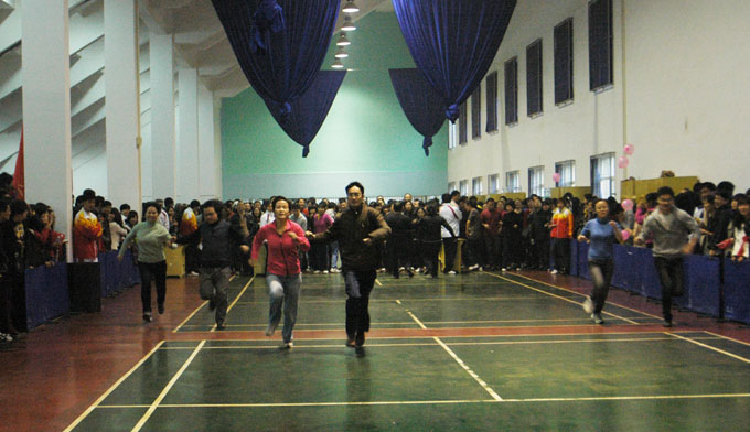 比赛项目分别为"爱心接力"、"穿针引线"、"集体跳绳"、"远水不解近渴"、"龙飞凤舞"、"忍辱负重"及"齐心协力"。无论是以传递气球为形式的"爱心接力",还是男女搭配的"穿针引线",都让我们感受到教职员工们积极活泼的一面。在"集体跳绳"这一项目中,各系教师配合默契,灵巧地越过甩在半空中的长绳,赢得场上一片喝彩。"远水不解近渴"这一项目同样引人关注。每组选手各拿两块盛满水的瓢,在越过障碍物后将水倒入桶中,教师们滑稽的动作引得在场观众笑声连连。"龙飞凤舞"比的是谁在规定时间内夹的乒乓球多,"忍辱负重"则由选手身扛10公斤的沙包赛跑。在"齐心协力"这一项目中,选手们将脚绑在一块,一起奔向终点。