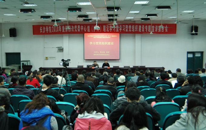 11月16日下午,我校2010年度第四次党委中心组(扩大)理论学习暨学习型党组织专题报告会在学术报告厅举行。湖南省委讲师团巡视员陈志强教授应邀为我校师生作了题为"学习型党组织建设"的主题报告。在校的部分校领导、中层干部、党支部书记、学生政治辅导员及部分学生党员干部参加了学习报告会。会议由党委副书记、副院长李云龙主持。