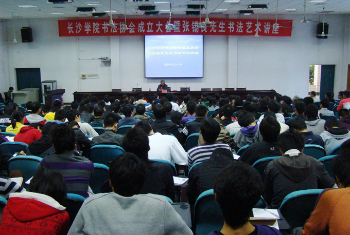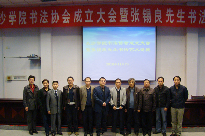 11月7日上午,致远楼学术报告厅内座无虚席,掌声不断。我校书法协会教工分会成立大会暨张锡良先生书法艺术讲座在此召开。中国书法"兰亭奖"评委、湖南省政协书画室副主任、我国当代书坛一流书家张锡良先生与大家漫谈书法艺术语言。长沙大学原校长李峻,党委副书记、副院长李云龙,党办(院办)主任周明侠,工会副主席敖洁文、教务处处长张世英、副处长唐依民、土木工程系党总支书记张跃佳、宣传部副部长余文龙、学生书协主席李青龙等出席了本次活动。