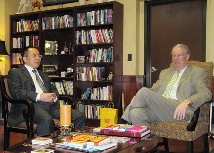 刘耘院长一行与东田纳西州立大学就双方互派交换生、交流学生、互认学分及互相给予学费优惠等问题深入探讨并达成广泛一致;与哈丁大学就联合举办英语教育2+2项目进行了深入具体的磋商;与阿肯色州立大学校长G. Daniel Howard博士签订了校际合作交流框架协议并和加拿大维多利亚大学商学院就具体推动落实中加企业管理人员培训项目一事达成了一致。