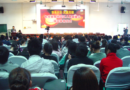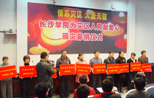 23日下午,我校将26万善款悉数转交给了长沙市慈善总会,长沙市民政局副局长、市慈善会秘书长伍仁华高度评价了我校的募捐工作,并向在场师生保证所得善款将在第一时间原封不动地被送往灾区。最后,李咏芳书记全面总结了此次募捐活动,赞扬了全校师生"一方有难、八方支援"的奉献精神,她还鼓励大家继续弘扬爱心,用爱托起祖国的明天。