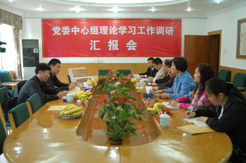 李云龙向检查组汇报了2008--2009年度我校党委中心组的理论学习情况。我校党委中心组的理论学习主要有三个特点:一、校党委高度重视,认真制订了学习计划,突出了把贯彻学习党的十七大精神,继续解放思想,推动科学发展作为中心组学习内容的核心,做到了把学习理论与学习路线、方针、政策、贯彻落实党委重要工作部署相结合,与始终保持共产党员先进性相结合,与加强班子自身建设相结合;二、坚持了中心组学习制度,学习方式、方法有所创新。三、坚持理论联系实际,把学习成果体现在指导实践、解决重大问题上。学校党委中心组在理论学习中始终坚持紧密联系学校工作实际,推动学院改革与发展。