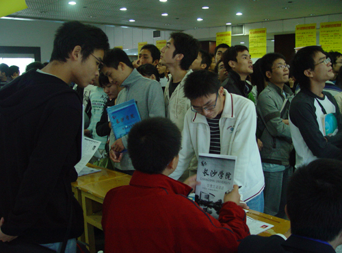 由长沙市经济技术开发区和我校招生与就业指导处联合举办的专场招聘会共吸引了落户经济技术开发区的22家用人单位和500多位应届毕业生参加。本次招聘会共提供了830多个岗位,岗位主要覆盖机械制造、模具、营销、计算机、文秘等专业。远大集团和三一重工作为长沙市工业产业的龙头老大,受到毕业生的追捧,远大集团招聘摊位前应聘的毕业生排起了长龙。